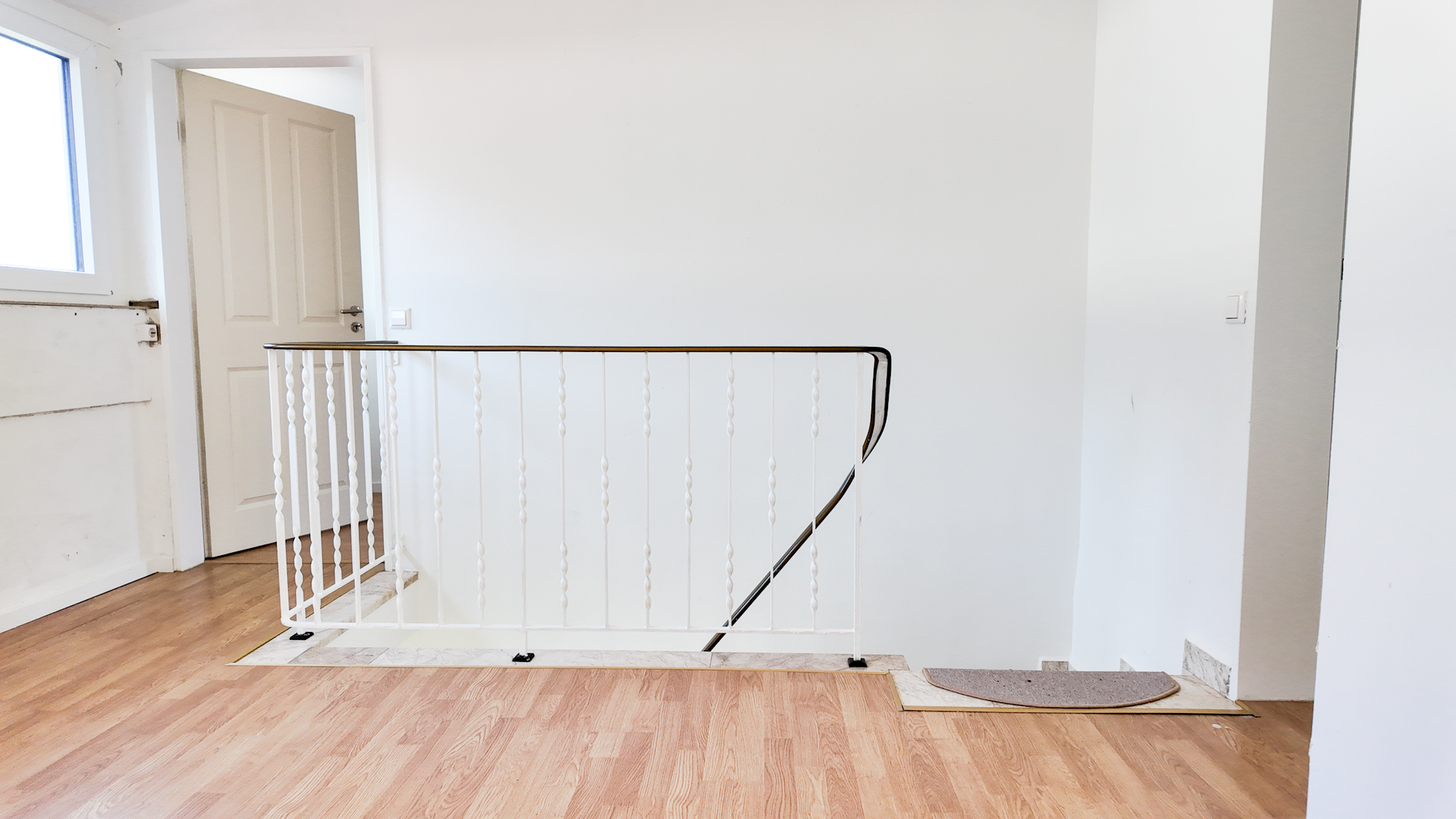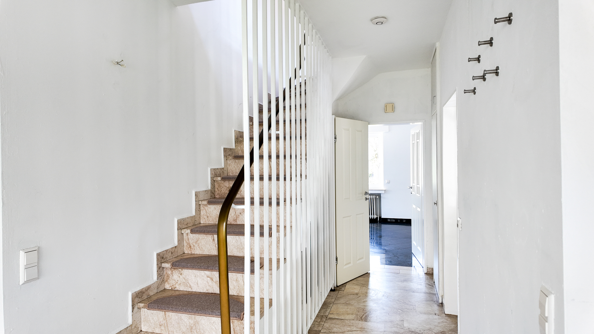 • Bereits beim Betreten des Hauses empfängt Sie ein einladender Eingangsbereich mit zentralem Treppenhaus, das sowohl in das Obergeschoss als auch in den Souterrain-Keller führt.